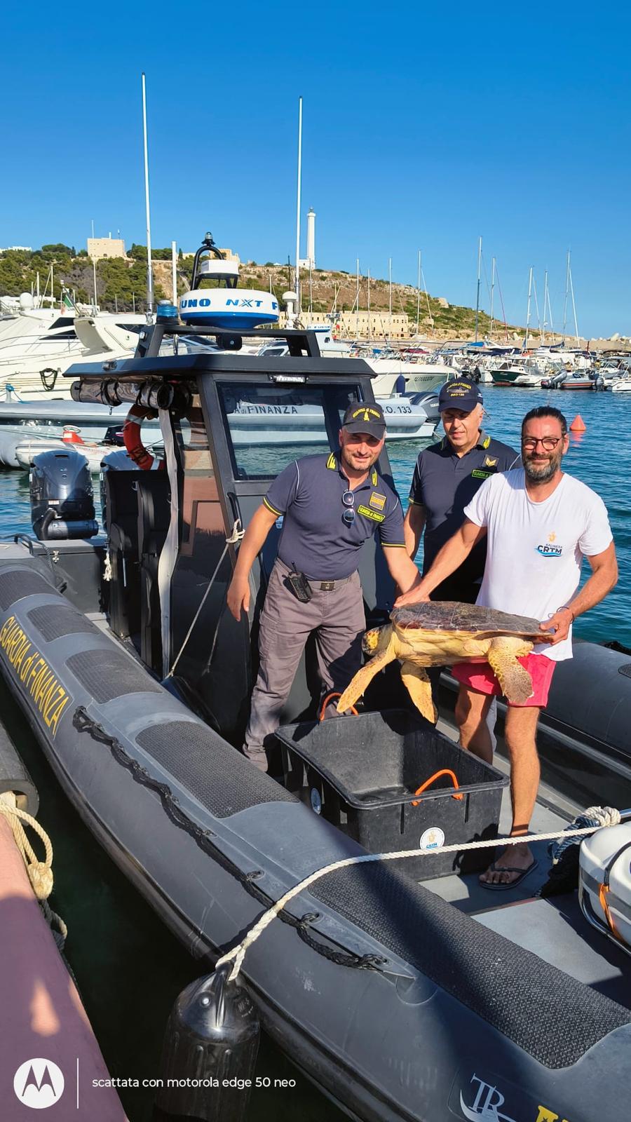 I due soci hanno immediatamente allertato la BSO.135 della Sezione Operativa Navale di Gallipoli della Guardia di Finanza, guidata dal Comandante M.llo Capo Andrea Luceri, che è prontamente intervenuta per mettere in sicurezza la tartaruga e trasferirla al Centro Recupero Tartarughe Marine di Calimera, dove riceverà le cure necessarie.
