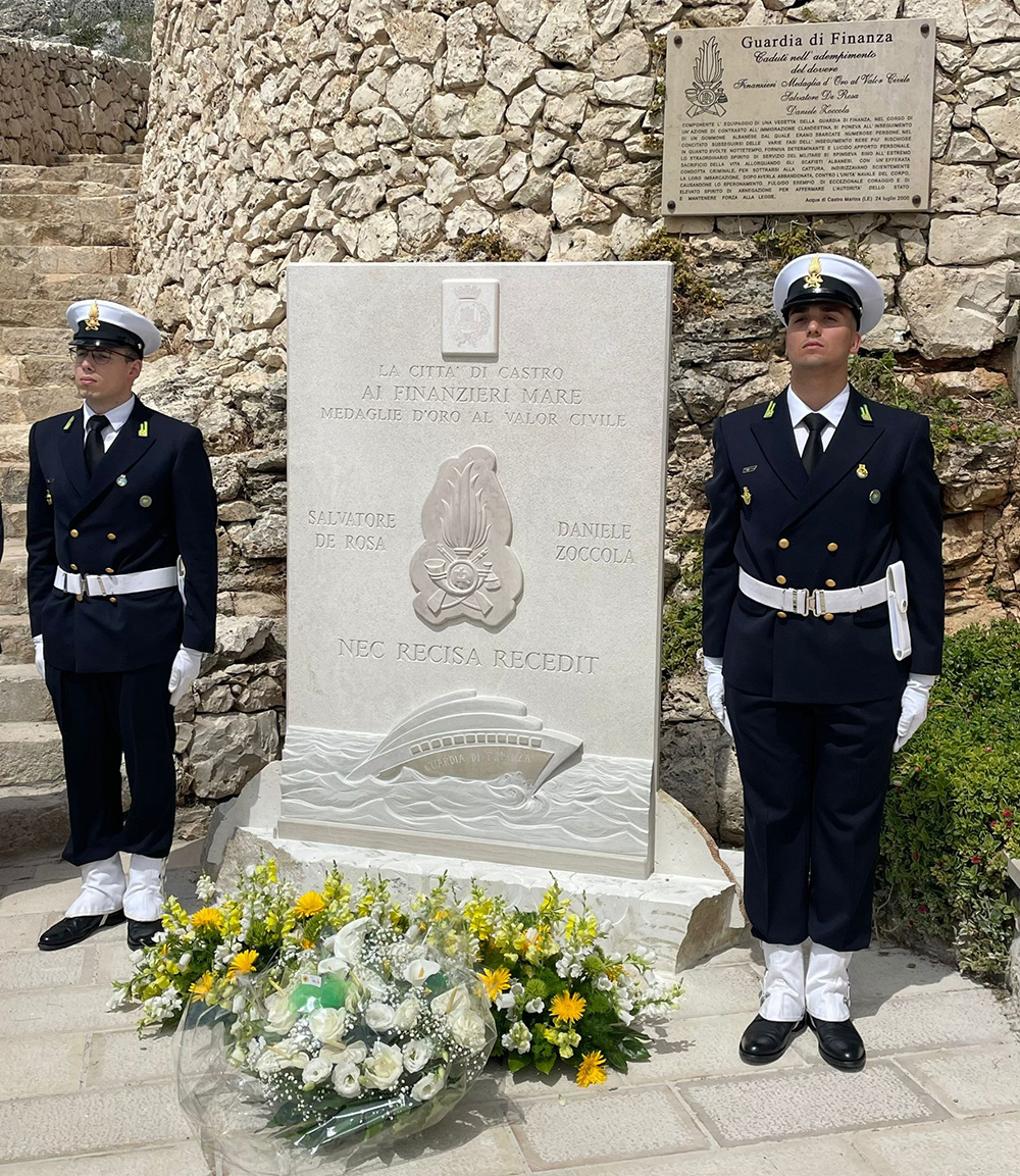 Nell’ambito delle iniziative organizzate per il 250° Anniversario di Fondazione del Corpo, si è tenuta nella marina di Castro la cerimonia di inaugurazione della nuova stele che l’amministrazione comunale di Castro ha inteso realizzare per commemorare e valorizzare la figura dei Finanzieri di mare Salvatore De Rosa e Daniele Zoccola, scomparsi prematuramente il 24 luglio del 2000.