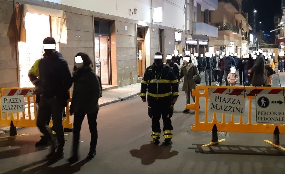Piazza Mazzini e piazza Sant’Oronzo prese d’assalto al punto che su via Trinchese (all’incrocio con via Cavallotti) la polizia locale è stata costretta ad imporre il senso unico di marcia ai pedoni, come in foto, per abbassare i contatti e scongiurare gli assembramenti (scatto di polizia locale channel, Telegram)