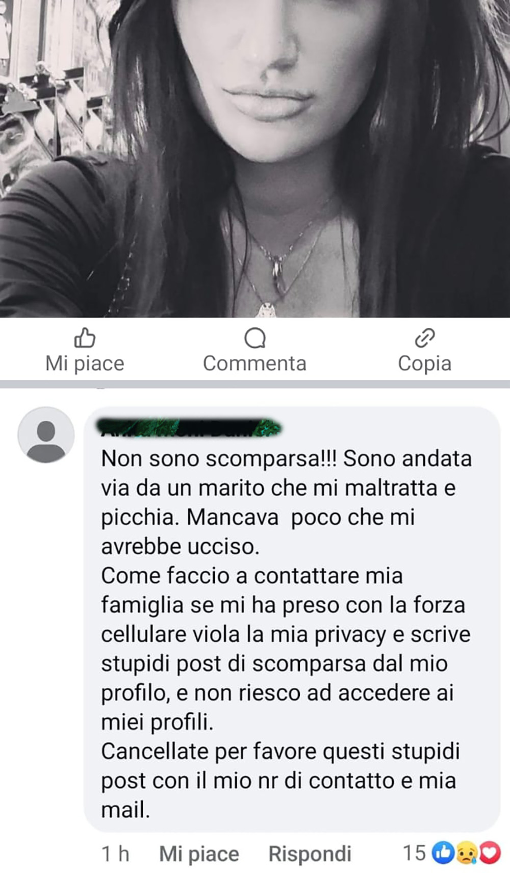 La richiesta infine di cancellare tutti i post con il suo numero di telefono e la sua mail.