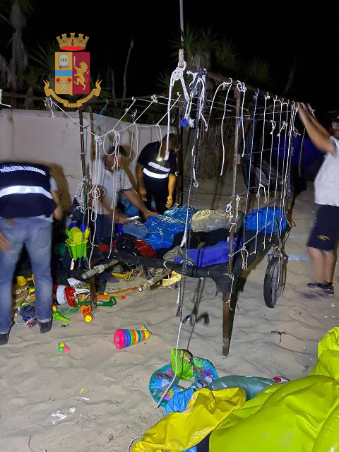 Nelle zone dove si sono svolti i servizi soni state sequestrate: 14 strutture mobili per la vendita di cui una piena di gonfiabili e giochi da spiaggia; una struttura mobile per esposizione; 5 tende comprensive di masserizie per il bivacco.
