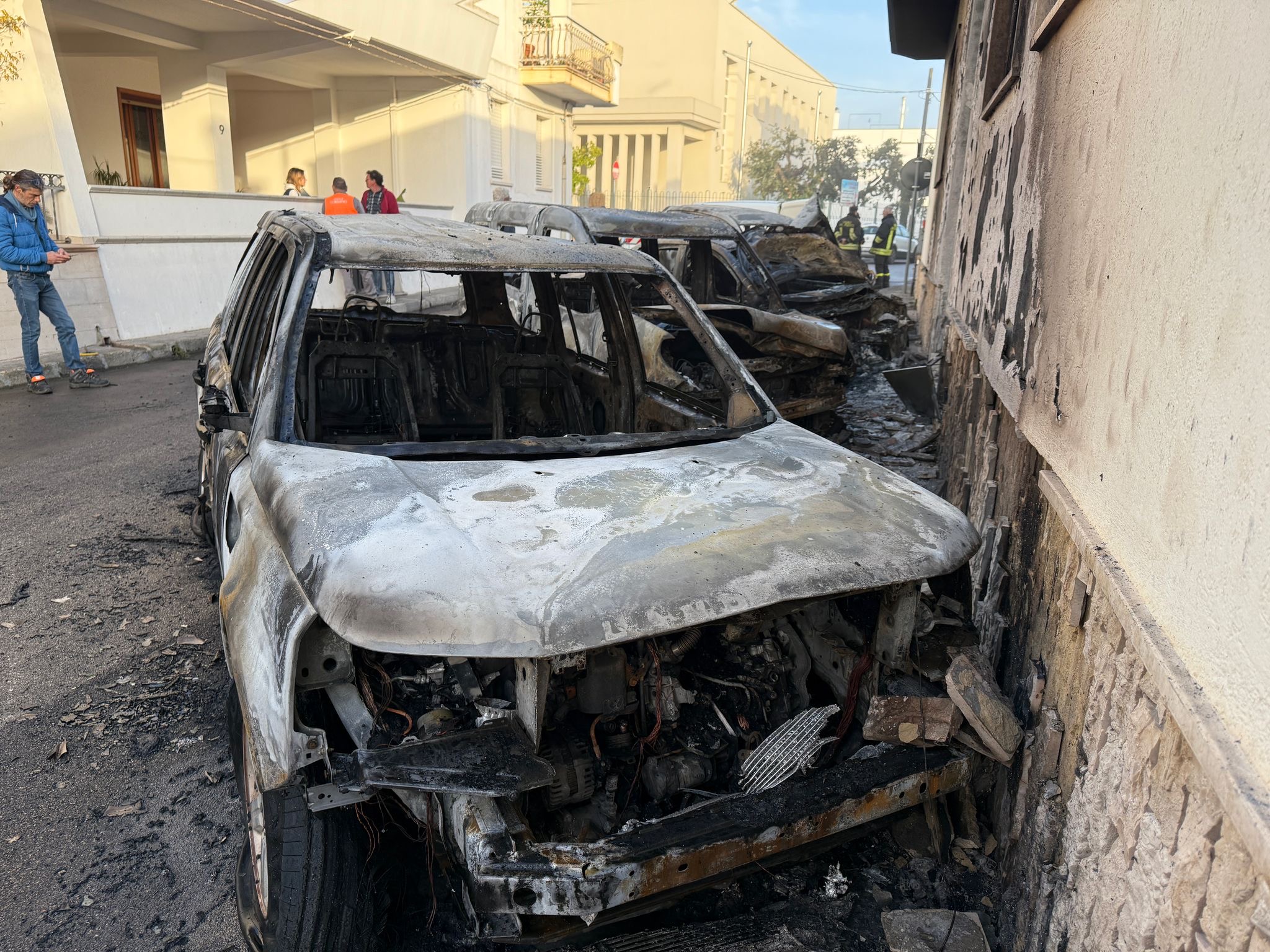 Sgomento e paura in via Giovanni Pascoli. Danneggiato immobile e date alle fiamme quattro auto. Contemporaneamente sulla SP 88 incendiati tre mezzi di movimento terra sempre della stessa azienda