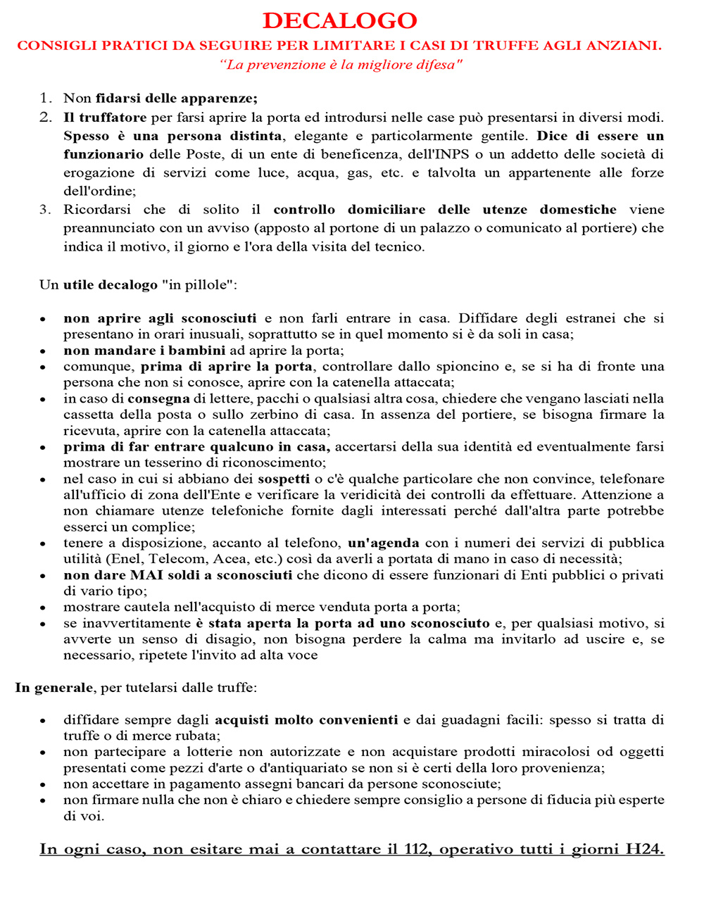 Come spesso ribadito nel corso dei vari incontri organizzati nella provincia e attinenti alla delicata tematica, i Carabinieri ricordano che sul sito istituzionale dell’Arma www.carabinieri.it, nella sezione “In vostro aiuto” – “Cose di tutti i giorni” – “Contro le truffe” – si può trovare un’ampia area in cui sono descritte le più frequenti modalità utilizzate dai malintenzionati e tutti i consigli da mettere in pratica. Invitano infine i cittadini a prestare la massima attenzione ad eventuali richieste di denaro sospette, informando tempestivamente le autorità competenti.