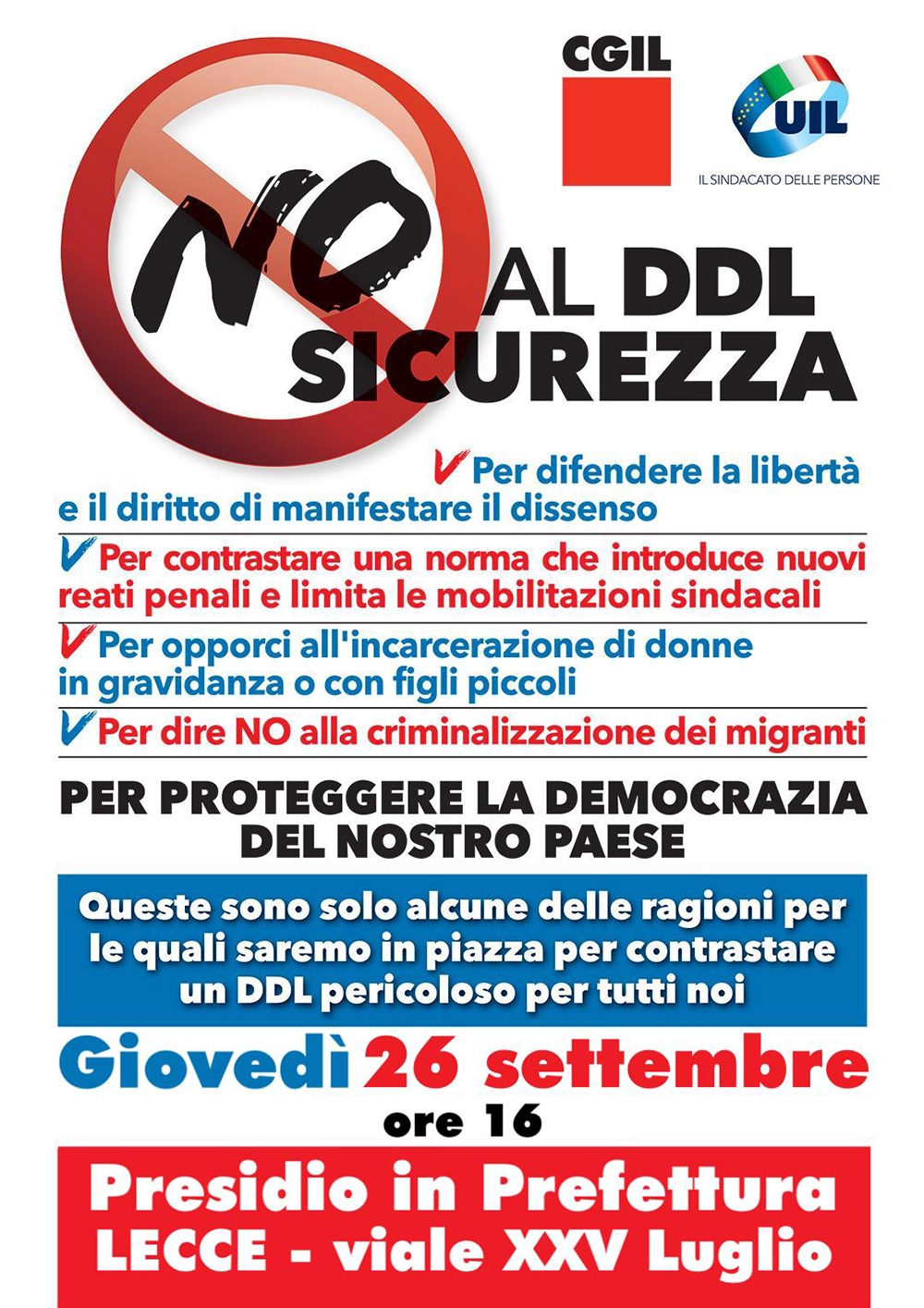 Cgil e Uil di Lecce organizzano un presidio davanti alla Prefettura in viale XXV Luglio a Lecce per contrastare il DDL Sicurezza, «una norma pericolosa che minaccia i principi fondamentali della nostra democrazia».