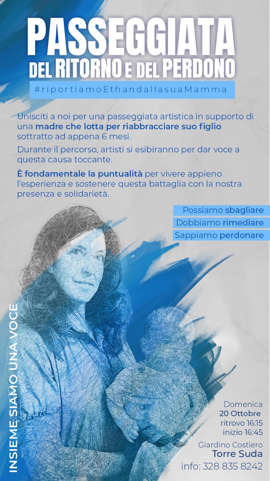 Inoltre quel luogo, per me, è il posto del cuore, è il posto della mia infanzia e delle mie radici, dove la mia famiglia è radicata da oltre 50 anni. Là sono cresciuta io, là ho sempre portato i miei figli e là avevo portato Ethan a fare i suoi primi bagnetti a mare. Purtroppo, il padre mi ha impedito di continuare questa tradizione di famiglia che per me è sempre stata un rito. Colgo l’occasione di ringraziare tutta la comunità che mi sarà vicino domenica, l’amministrazione comunale e tutti gli organizzatori che hanno lavorato da settimane con grande impegno per la migliore riuscita dell’evento, a partire da mia sorella Ilaria Ciampa, mio nipote Emanuele Balsamo e i miei amici Antonella e Alessandro Santantonio».
