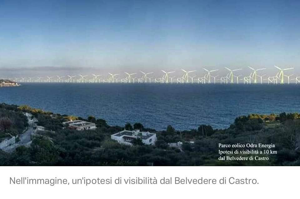 Lo fa pubblicando una proiezione visiva, dal Belvedere di Castro, realizzata da Legambiente sul progetto Odra Energia, delle società Falck Renewables e BlueFloat Energy. Nell’immagine diffusa, una distesa choc di pale visibili dalla costa nel tratto tra Porto Badisco e Castro.
