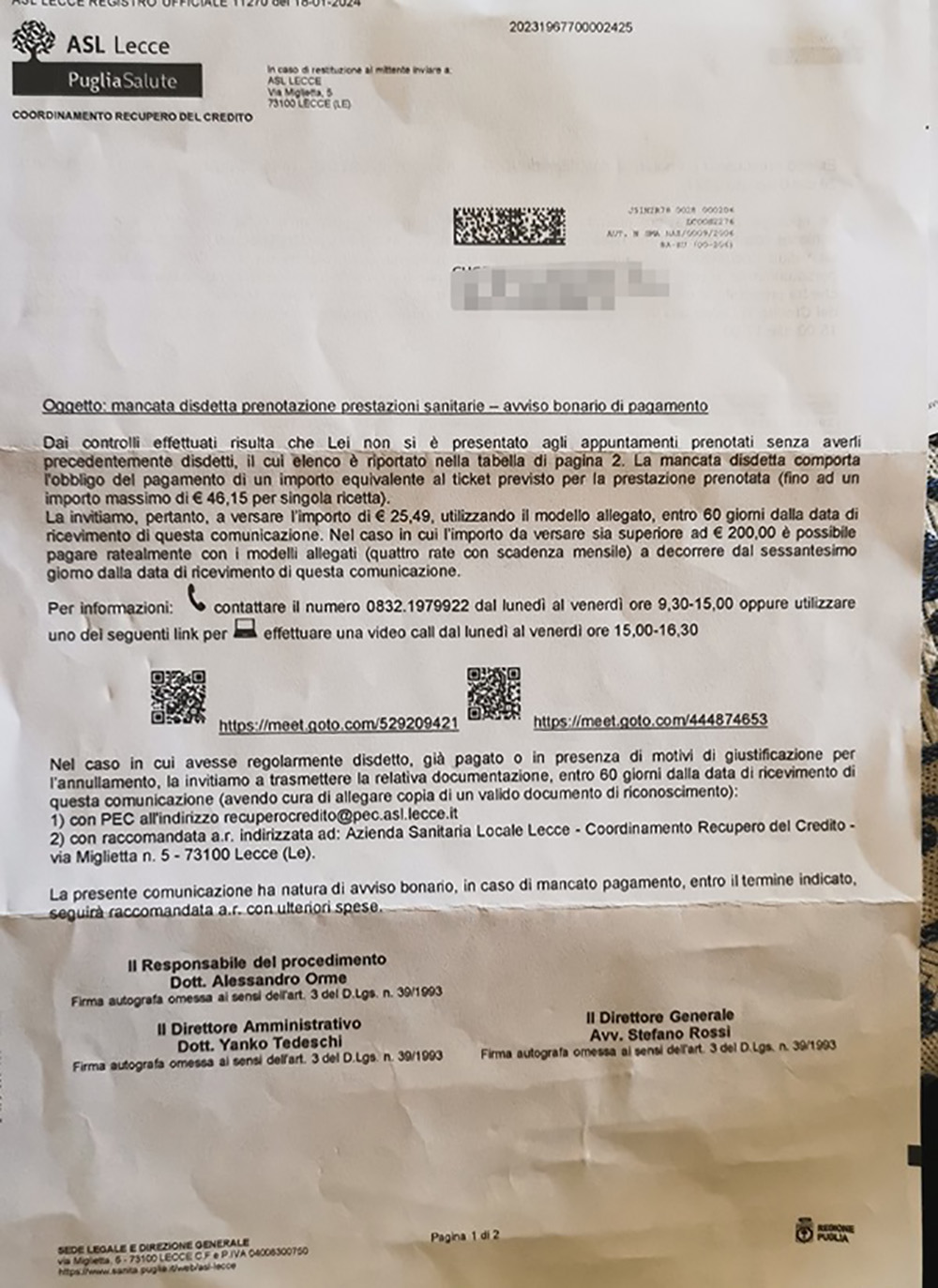 Uno degli avvisi bonari spediti dall’Asl Lecce