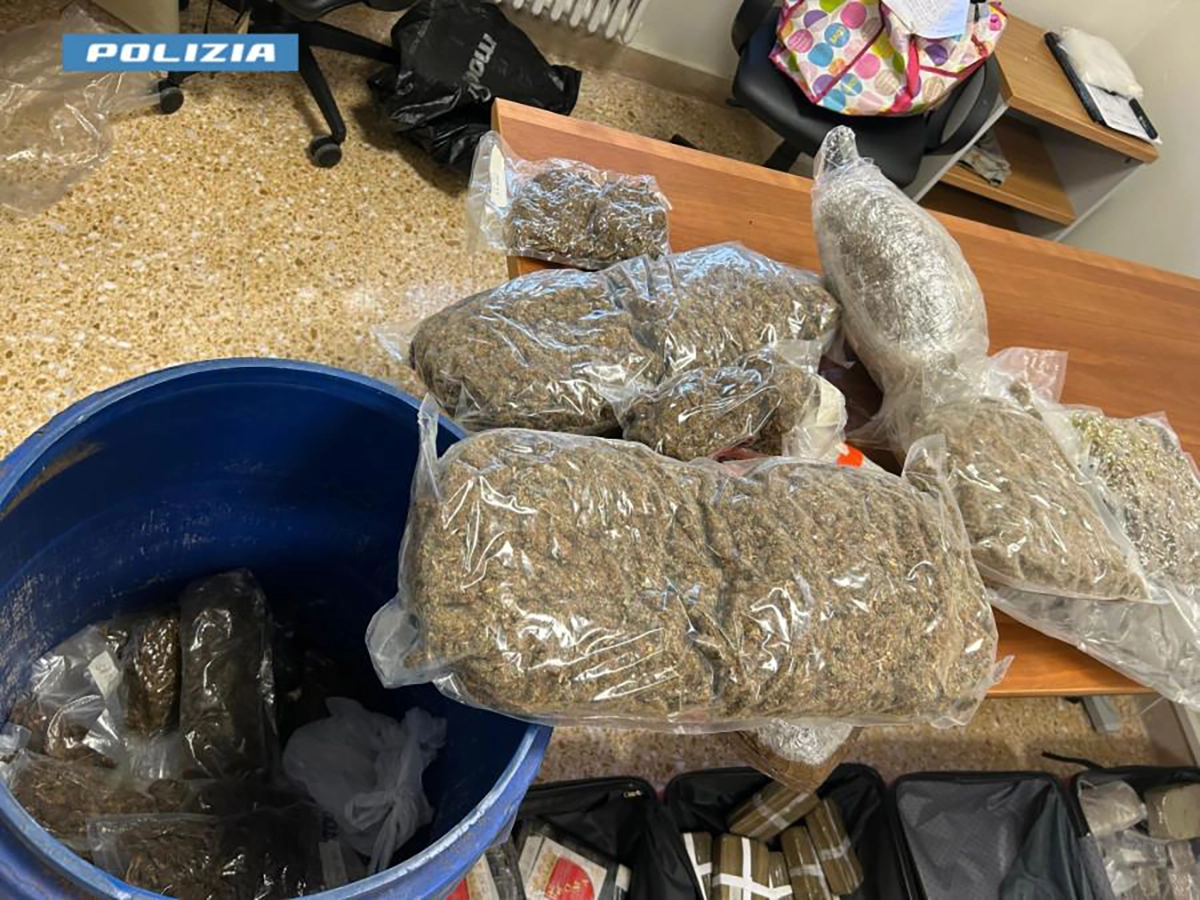 Il materiale era suddiviso con precisione per tipologia e destinazione: 25,5 kg di hashish, 13,2 kg di cocaina, 13,2 kg di eroina e 26,2 kg di marijuana, confezionati in buste termosaldate, valigie, bidoni e scatole, pronti per l’immissione sul mercato.