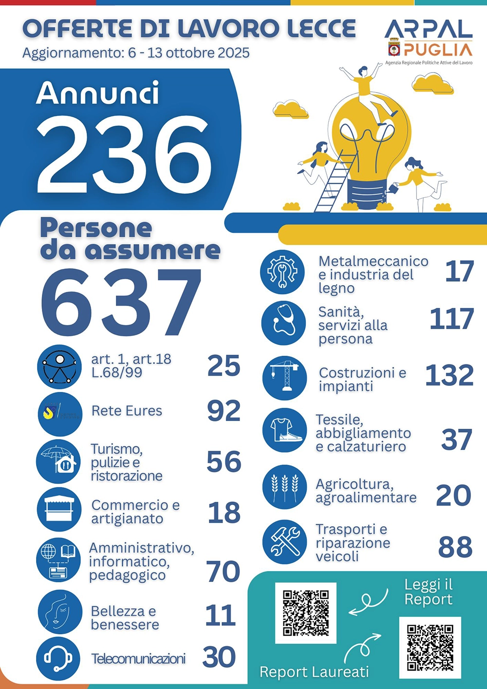 Dal Report settimanale di Arpal Puglia: 637 posizioni aperte nel leccese. Intanto, il Camper del Lavoro continua il suo viaggio e, dal 6 ottobre al 9 ottobre, sarà a Zollino, Castrignano del Capo, Veglie, Patù, Castrignano dè Greci, Presicce-Acquarica, Corigliano d’Otranto, Salve e Ruggiano