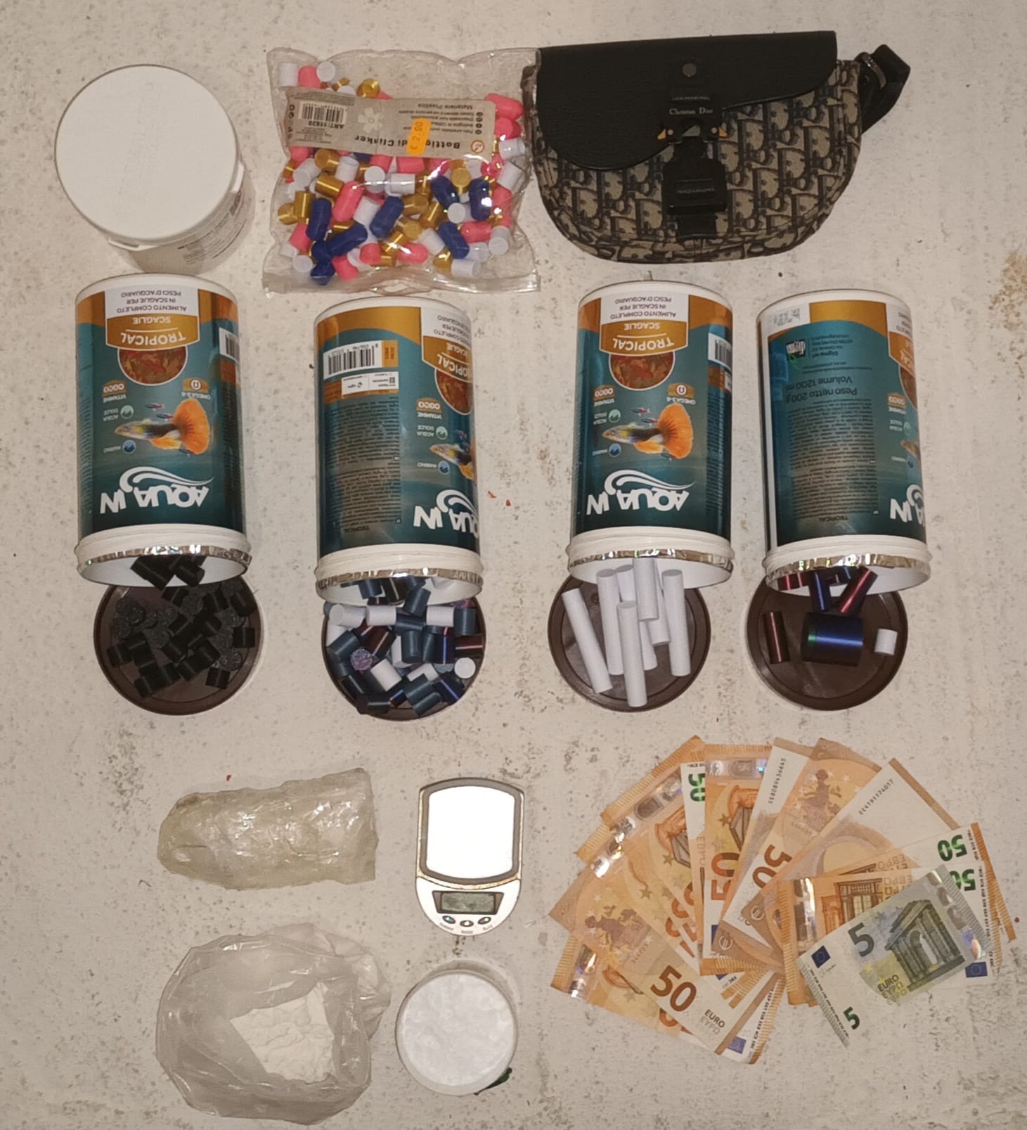 L’acquirente é stato sorpreso con una dose di cocaina del peso di 0.20 grammi contenuta all’interno di un involucro di plastica dura apribile a forma di cilindro con tappo a vite. All’interno dell’abitazione venivano in seguito rinvenute diverse centinaia di contenitori identici a quello in possesso dell’acquirente, suddivisi per colore a seconda della dimensione, presumibilmente per distinguere il peso delle dosi da confezionare, nonché un piccolo imbuto utile al riempimento degli stessi.