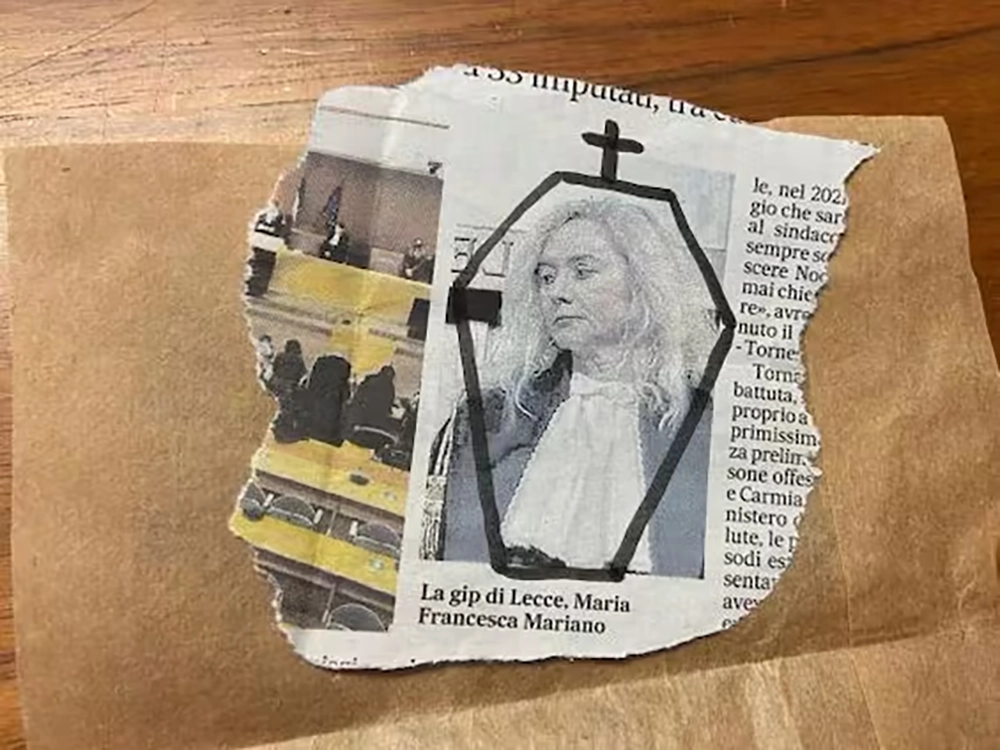 Nell’ottobre dello stesso anno, in un’aula, alla vigilia di un’udienza, fu ritrovato un ritaglio di giornale relativo a un’inchiesta e sulla foto della gip era stata disegnata una bara (foto in basso).