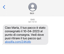 Il malfattore, spacciandosi per un corriere espresso, invia un messaggio alla vittima nel quale afferma che un pacco è stato recapitato presso un punto di consegna ed è in attesa di ritiro.