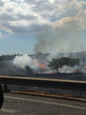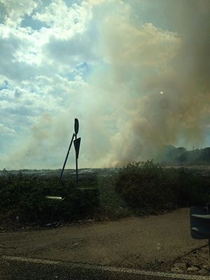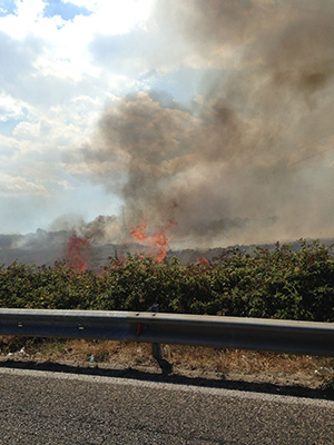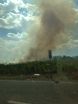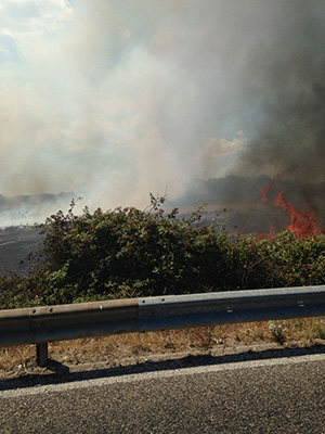 Il Salento continua a bruciare. Questa volta un ampio incendio è divampato subito dopo l’ora di pranzo sulla Lecce-Maglie, all’altezza dello svincolo per Poggiardo, obbligando le forze dell’ordine a chiudere la Statale al traffico a causa della scarsa visibilità provocata da miasmi e fuliggine.