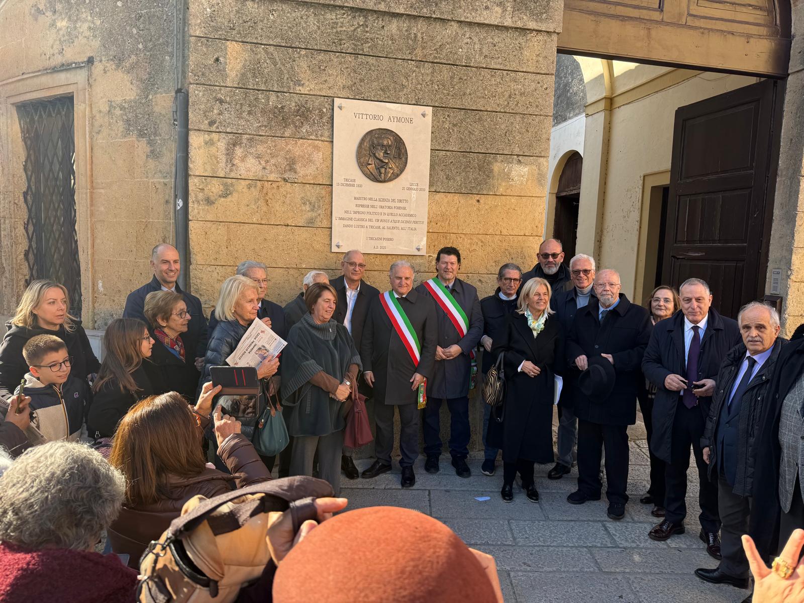 È stata disvelata questa mattina, sabato 13 dicembre 2025, presso la dimora natale, sita in Largo Sant’Angelo, a Tricase, un’epigrafe dedicata all’avvocato Vittorio Aymone.
