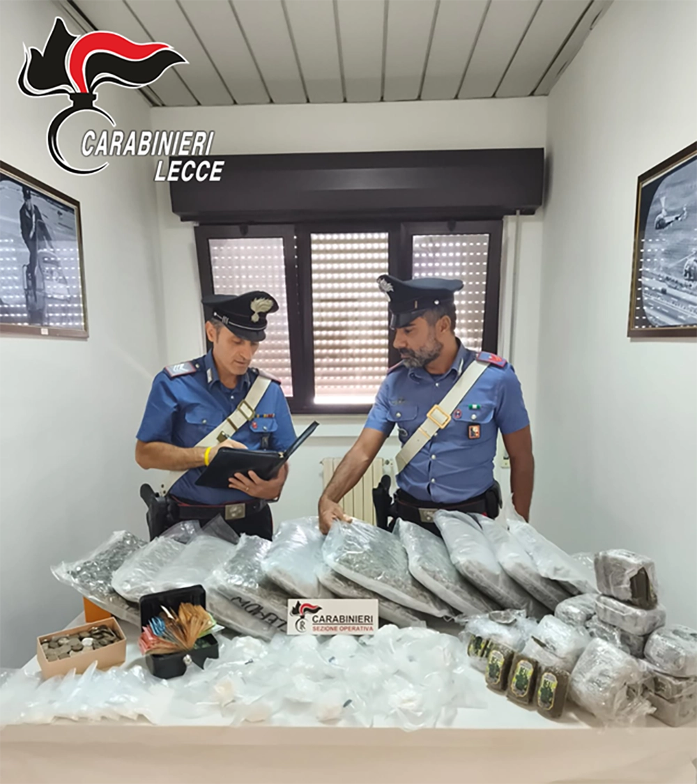 A Taviano, in casa di un 50nne, i carabinieri hanno trovato nascosti in due borsoni, occultati vicino al muro di cinta esterno dell’abitazione, 11 chili marijuana, 7 chili di hashish e quasi un chilo di cocaina.