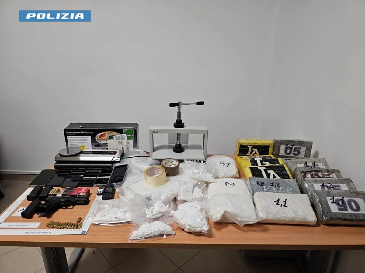 Complessivamente sono stati sequestrati oltre 17 chili e 400 grammi di cocaina, confezionata in panetti e buste sottovuoto, oltre a una pistola semiautomatica calibro 9×19 con caricatori e munizioni.