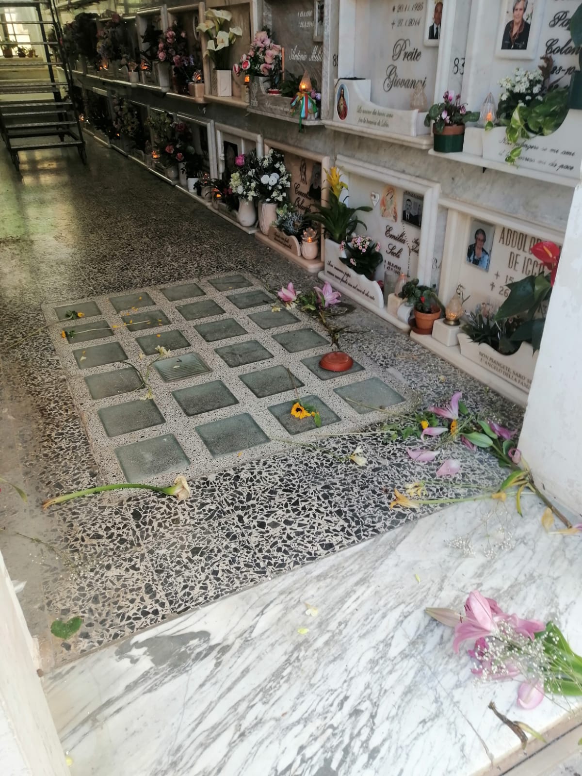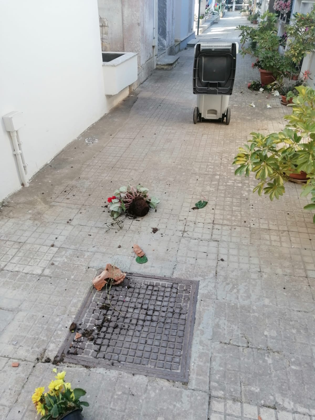 Cassonetti della spazzatura capovolti, corone di fiori rovesciate a terra, fiori nelle fioriere di alcune lapidi strappati, buttati a terra e calpestati…