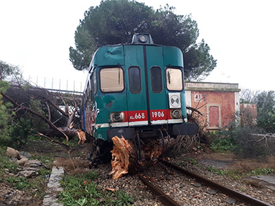 La tromba d’aria ha letteralmente spezzato in due un grosso albero il cui enorme tronco è crollato sui binari tagliando la strada ad un treno, in marcia sulla tratta Casarano-Novoli.