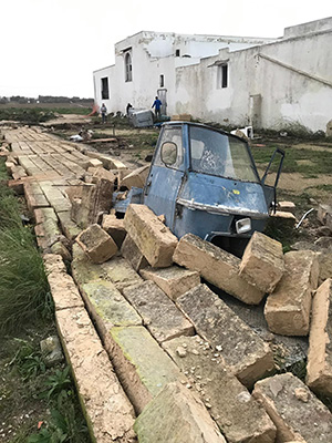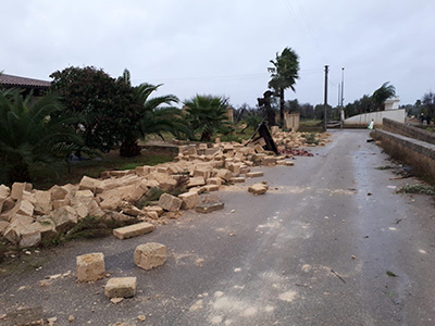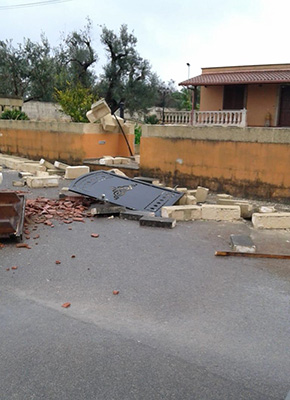 Nella stessa zona un muretto composto da nove file di mattoni è stato scaraventato a terra ed ha letteralmente sotterrato una moto ape.