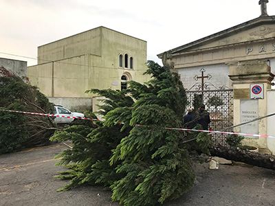 Al cimitero la tromba d’aria ha scoperchiato molte cappelle come quella di Sant’Antonio (nelle foto) e per questo momentaneamente non è consentito l’accesso. Si stanno verificando eventuali criticità.