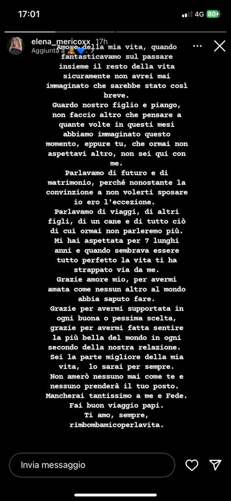 Ancor di più, dopo le parole della compagna. Dal letto di ospedale dove è ricoverata a Lecce, dopo aver dato alla luce il bimbo che portava in grembo (proprio poco dopo il tragico sinistro), la neomamma ha scritto uno struggente messaggio d’amore e d’addio al suo compagno (nella foto che segue): “Guardo nostro figlio e piango, non faccio altro che pensare a quante volte in questi mesi abbiamo immaginato questo momento, eppure tu, che ormai non aspettavi altro, non sei qui con me”.