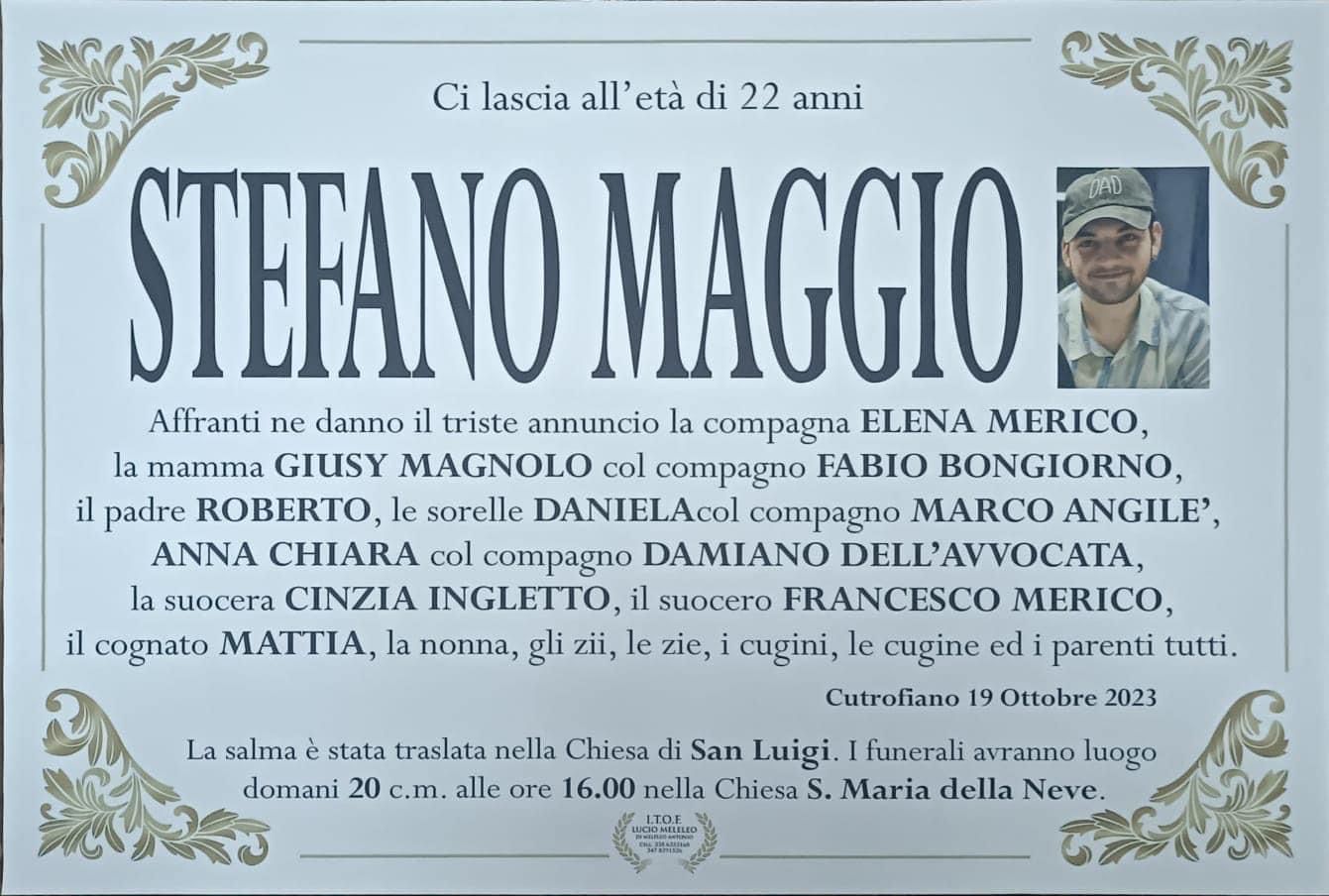 Dolore e lacrime a Cutrofiano per l’ultimo saluto a Stefano Maggio, il ragazzo tragicamente scomparso in un incidente stradale sulla Maglie-Lecce mentre era in auto con la compagna incinta.