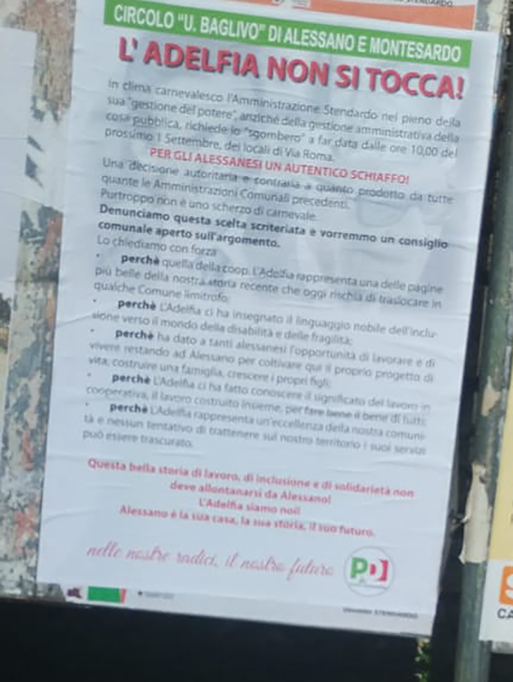 Il circolo locale del Pd ricorda che: «Quella della coop. L’Adelfia rappresenta una delle pagine più belle della nostra storia recente che oggi rischia di traslocare in qualche Comune limitrofo; L’Adelfia ci ha insegnato il linguaggio nobile dell’inclusione verso il mondo della disabilità e delle fragilità; ha dato a tanti alessanesi l’opportunità di lavorare e di vivere restando ad Alessano per coltivare qui il proprio progetto di vita, costruire una famiglia, crescere i propri figli. Questa bella storia di lavoro, di inclusione e di solidarietà non deve allontanarsi da Alessano! L’Adelfia ci ha fatto conoscere il significato del lavoro in cooperativa, il lavoro costruito insieme, per fare bene il bene di tutti».