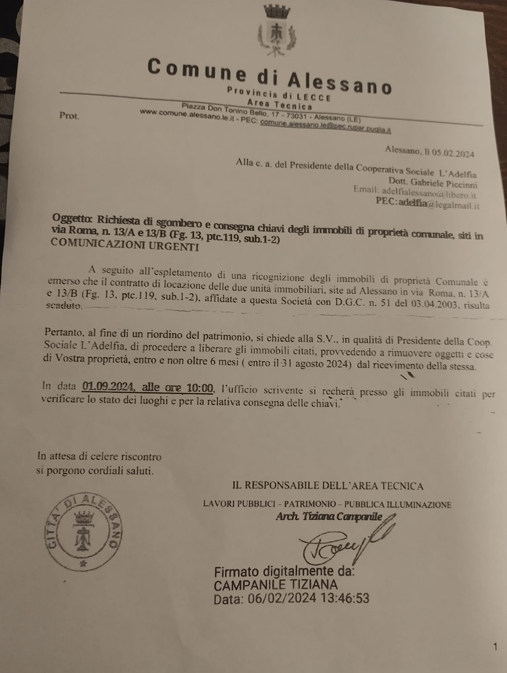 Ordinanza di sgombero del Comune di Alessano a L’Adelfia.