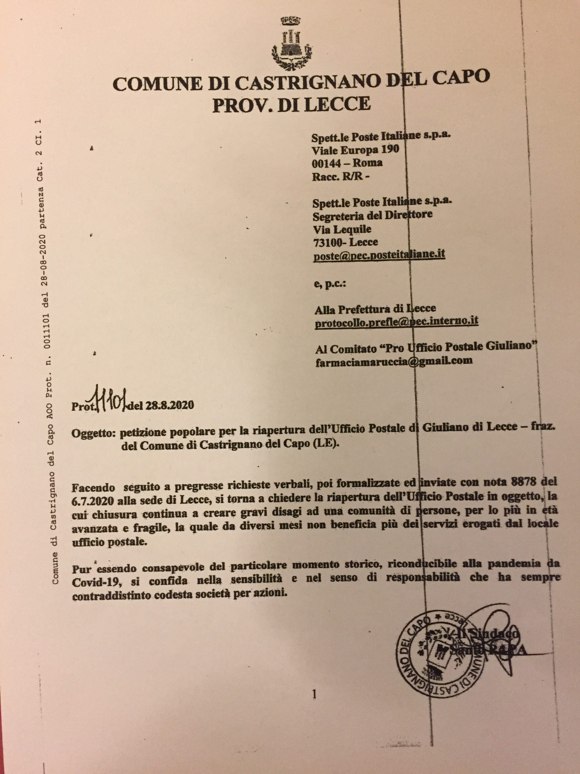 Il comitato ha indirizzato al Comune di Castrignano del Capo una raccolta firme con 228 sottoscrizioni con la quale si chiede «a gran voce la riapertura dell’ufficio postale ubicato nella frazione di Giuliano di Lecce. Questo ufficio, sin dalla sua apertura, ha offerto un prezioso servizio alla comunità, pur con un orario settimanale ridotto (aperto nei soli giorni pari della settimana). Dai primi di marzo, causa emergenza covid, il servizio è sospeso. La comunità giulianese, però, continua ad esistere! Continuano ad esistere anche tutti quei bisogni che hanno indotto la sua apertura negli anni addietro».