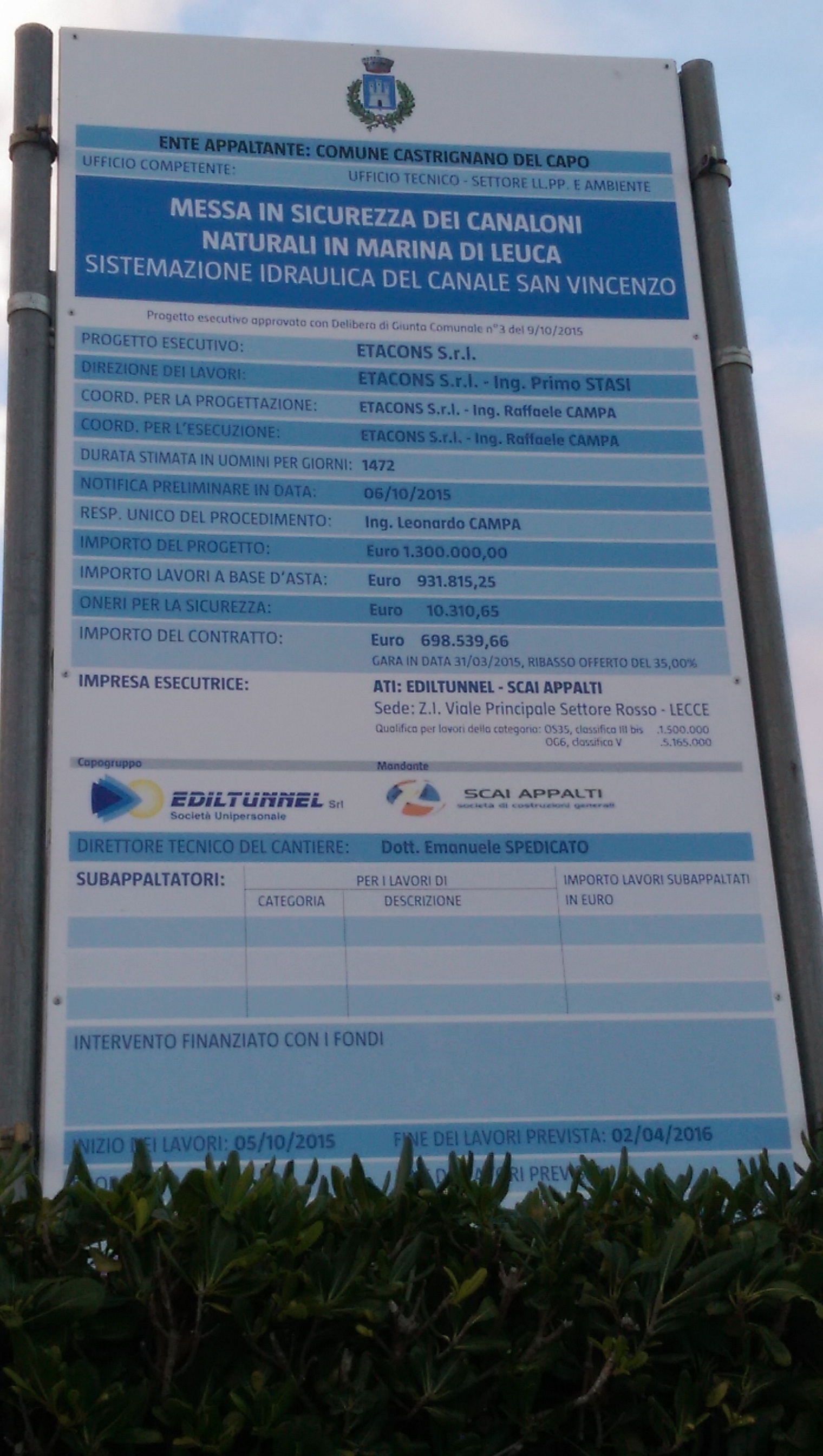 Le associazioni Castrignano a Capo e Uniti per Leuca, con i cittadini riunitisi in comitato spontaneo, hanno messo in piedi una raccolta firme per chiedere all’amministrazione di Castrignano del Capo di sospendere e rivedere il progetto di messa in sicurezza dei canaloni naturali, con particolare riferimento alla sistemazione idraulica del canale San Vincenzo. Si tratta di un intervento da 1,3 milioni di euro, già appaltato ed avviato, per costruire una conduttura sotterranea che convogli le acque piovane sotto al ponte di via Alberto da Giussano e le porti in mare (foto a fine articolo). Un impianto che attraverserà la pancia di via Gorizia, passerà accanto ad abitazioni, hotel e villa comunale per sfociare tra i lidi. Le nuove tubature saranno parallele al vecchio canale che scorre lungo un percorso simile ma scoperto e privo di qualsivoglia impianto di convogliamento e spinta artificiale e tuttora sfocia a pochi metri dal punto in cui è previsto il nuovo sbocco per il canale in costruzione.