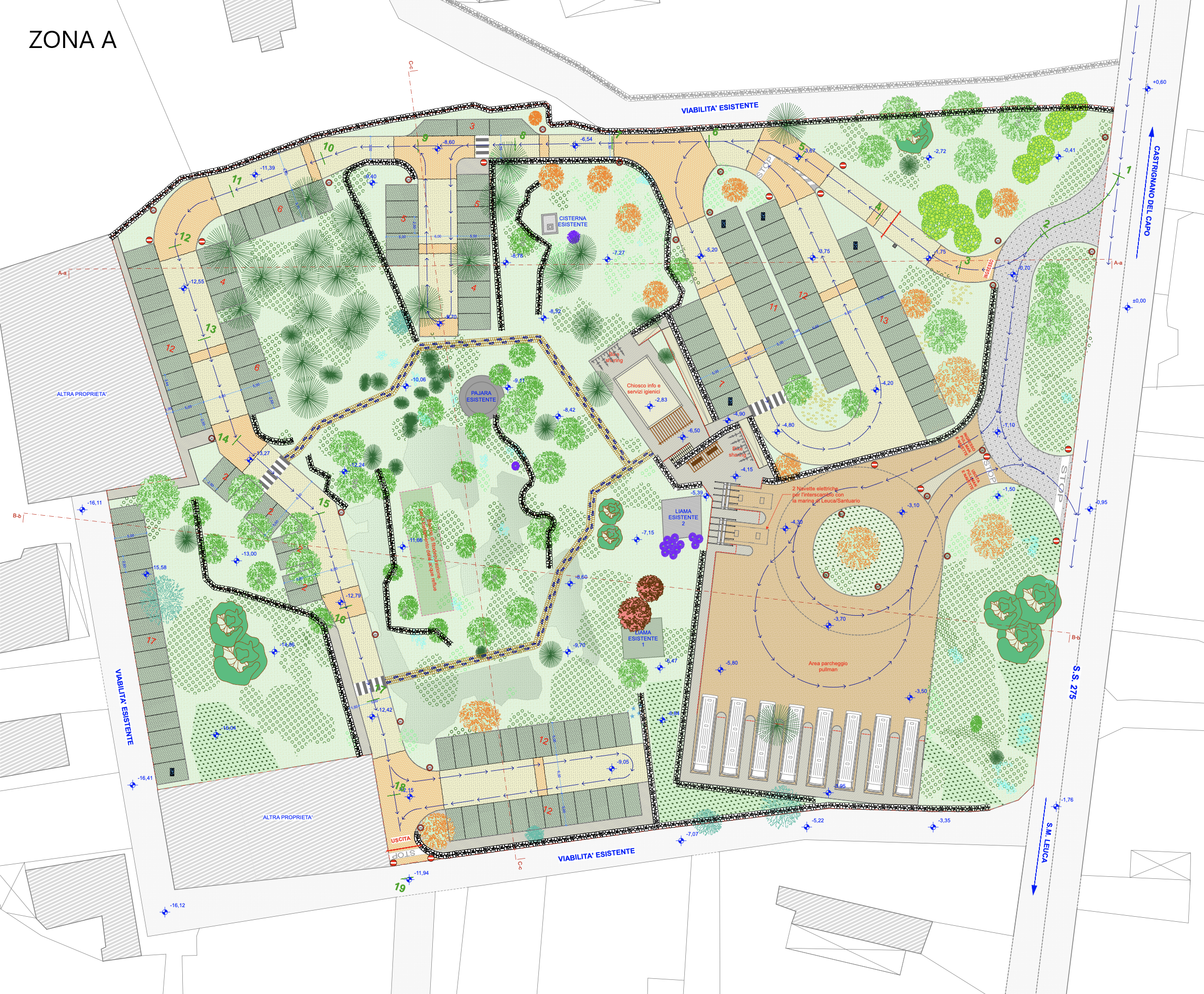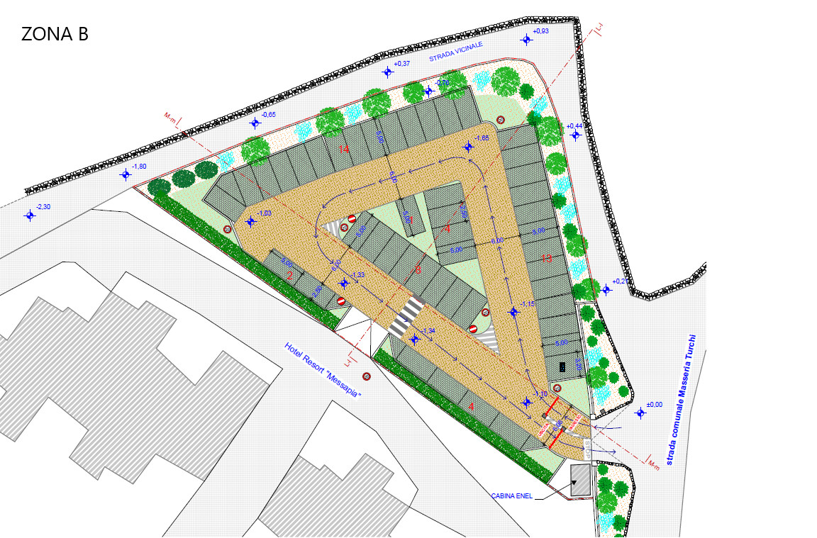 Il parcheggio diffuso di interscambio si compone di tre zone funzionali essenziali: la viabilità di raccordo con la SS 275 costituita da una rotonda di smistamento del traffico permettendo tra l’altro l’inversione di marcia in sicurezza; la zona a parcheggio dedicata alle automobili che conta complessivamente 183 posti auto di cui 137 nella zona A e 46 nella zona B; il parcheggio riservato agli autobus, con 8 stalli dedicati, e navette elettriche con 2 terminali per la ricarica solare.