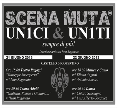 Per gli allievi del Centro Studi d’Arte “Scena Muta” di Copertino è giunto il tanto atteso momento dei saggi finali di musica, danza e teatro. Al termine di un lungo e faticoso percorso formativo sotto l’attenta e scrupolosa direzione artistica di Ivan Raganato, avrà luogo infatti nella splendida cornice del Castello di Copertino, lo spettacolo dal titolo “UN1CI&UN1TI sempre di più”. «Il titolo dell’evento – dichiara Ivan Raganato – rimarca la forza di un gruppo compatto che punta tutto sulla sua unicità. Non un ideale, ma un manifesto ed un programma per chi fa parte di Scena Muta, chi investe il proprio tempo e la propria energia per l’amore dell’arte e spende i propri sogni per vedere realizzati grandi progetti. Sono i nostri allievi che ci spingono ad andare avanti, le loro idee, la loro passione, la loro energia ed emozione. Nel rivedere me stesso in loro, non smetto di sognare, di pensare a nuovi e grandi progetti, sono la mia scommessa vincente». Gli appuntamenti dove talento, passione e ambizione degli allievi di “Scena Muta” si mescoleranno in un intenso connubio artistico, sono fissati per venerdì 21 giugno alle ore 18 con il Gruppo di Teatro dei ragazzi che proporrà “Giuseppe Boccaperta”, rappresentazione teatrale ispirata alla vita di San Giuseppe da Copertino; alle ore 20,30 il Gruppo di Teatro degli adulti si esibirà in “Giulietta, Romeo e Giuliana”, rielaborazione in chiave tragicomica del famoso dramma shakespeariano. Sabato 22 sarà la volta della musica e della danza: alle ore 18 i saggi dei Maestri di pianoforte e canto Eliana Augusti e Antonio Ancora, cantante ed ex vocalist degli Aram Quartet (vincitore della prima edizione di X Factor); alle ore 20,30 le coreografie preparate da Chiara Scardigno, ballerina solista del Balletto di Puglia, e dal maestro di balli latino americani Luis Alberto Gonzales.