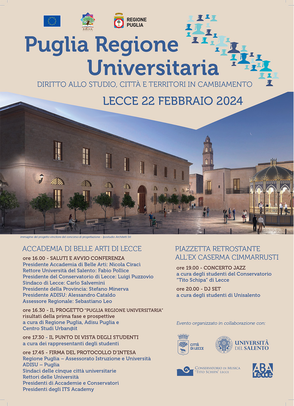 Con l’approvazione dell’Agenda Regionale del Diritto allo Studio, esito del percorso di ricerca ed istituzionale “Puglia Regione Universitaria” nel quale Regione, Adisu, Atenei e Città Universitarie in dialogo con le organizzazioni studentesche, si è tracciato un quadro di riferimento programmatico rispetto al quale collocare le singole politiche e azioni per una piena cittadinanza studentesca, spingendosi a valutare l’efficacia della loro messa a terra attraverso alcuni progetti bandiera, tra cui il progetto di recupero come Residenza Universitaria Urbana del seicentesco convento dei Carmelitani Scalzi (Caserma Cimmarrusti) recentemente finanziato e che costituisce un caso esemplare anche grazie alla visione strategica del Comune di Lecce.