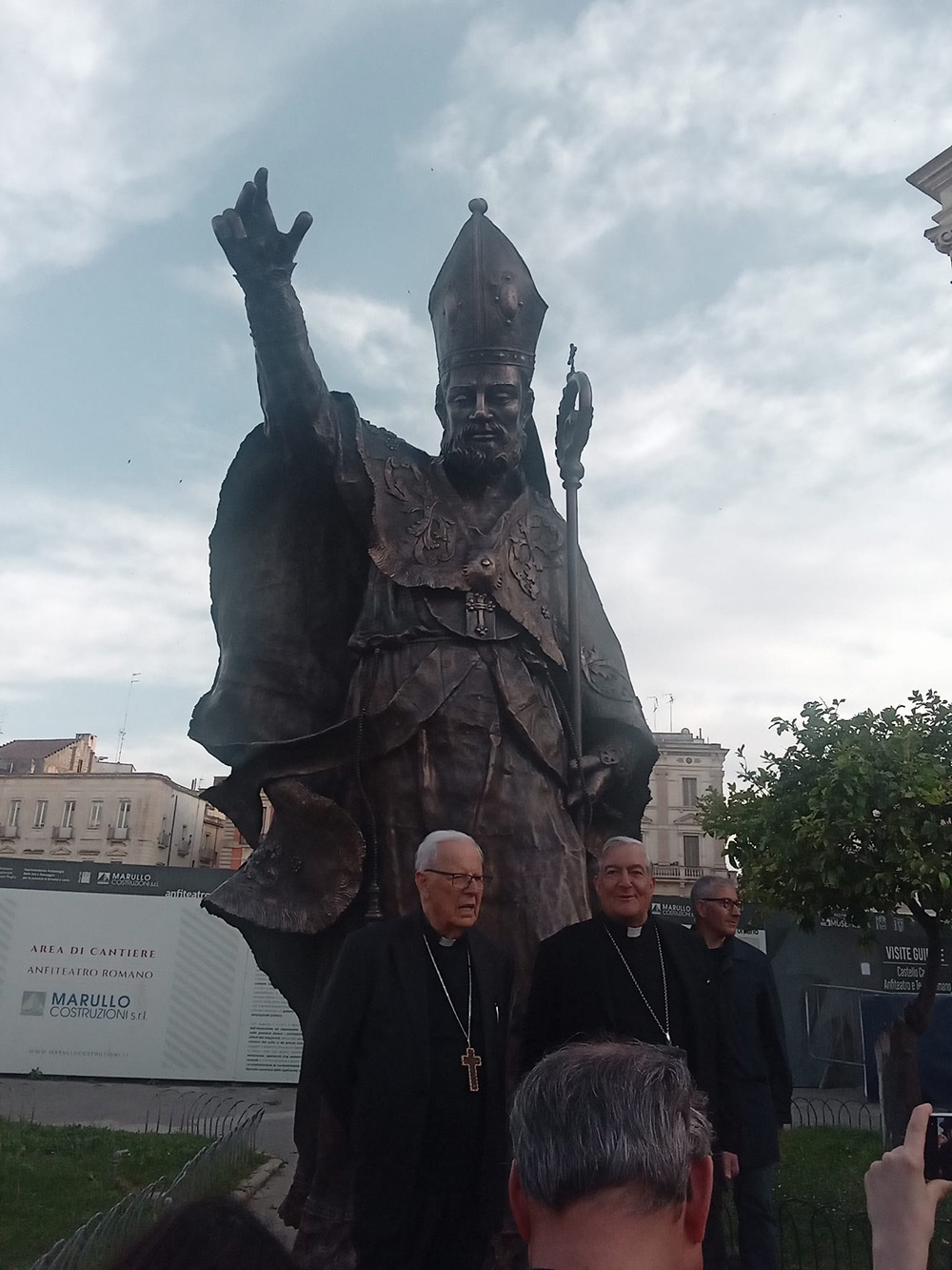 Simile, quasi identico nella forma, diverso nella tecnica esecutiva, il nuovo simulacro di sant’Oronzo prende il posto dell’originale che, fragile e provato dal tempo, è stato messo al riparo. I cittadini e i visitatori rivedranno la sagoma del Patrono dominare la sua piazza, mentre continueranno a fruire da vicino, per ora nel vicino androne di Palazzo Carafa, della statua del 1739, ammirandone i dettagli e cogliendone gli aspetti (e i difetti) tecnici.
