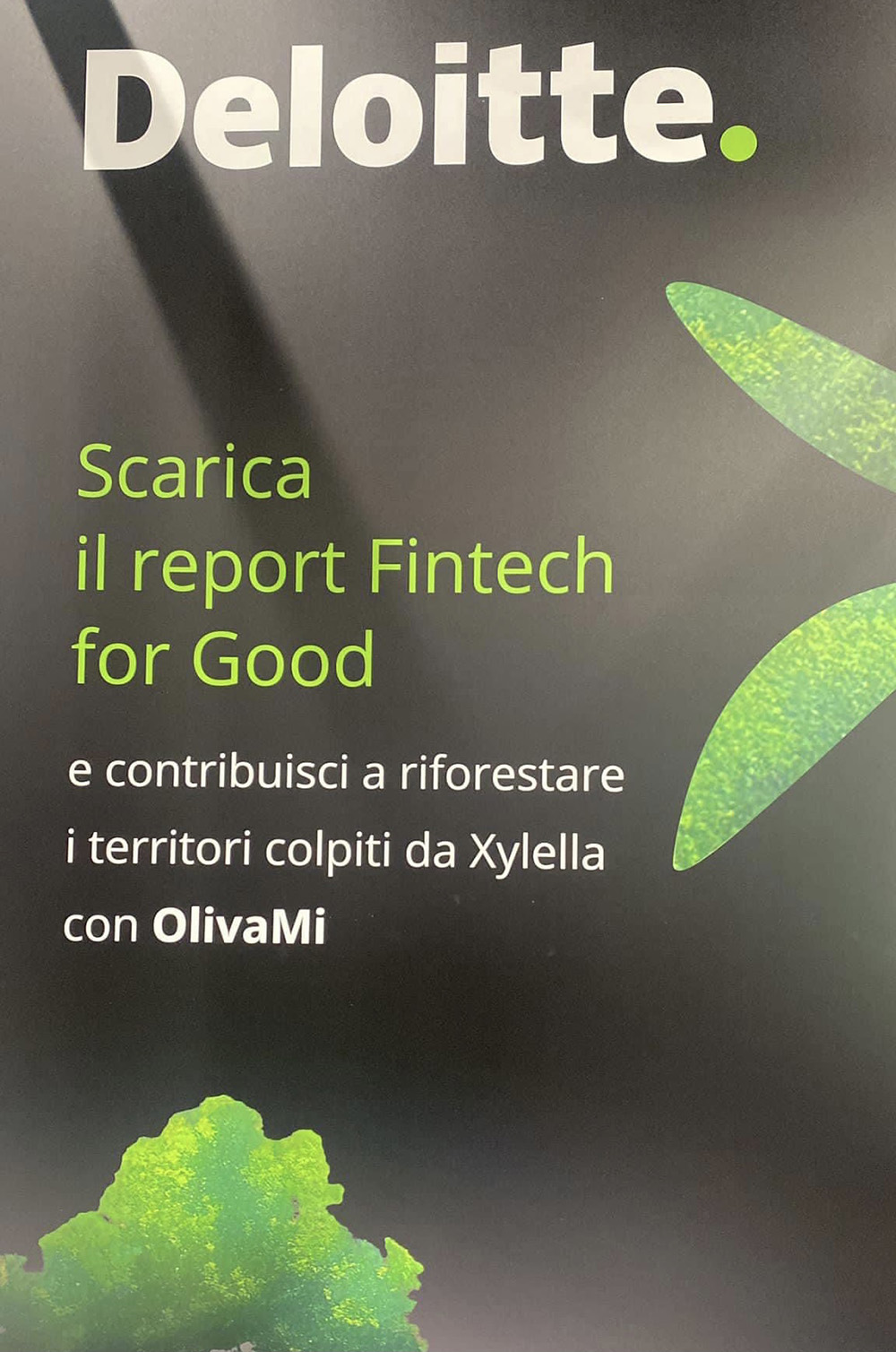 «Abbiamo avuto la possibilità di raccontare ad una vasta platea il nostro impegno per la riforestazione del Salento e siamo davvero orgogliosi di aver intercettato l’interesse di Deloitte», aggiunge Simone Chiriatti direttore di Olivami, «creando un ponte verde tra Bari che ospiterà il grande hub di Deloitte e il Salento della rinascita olivicola».