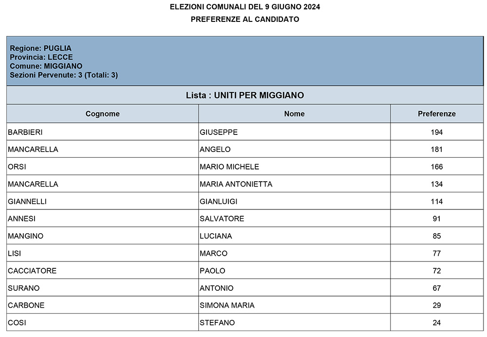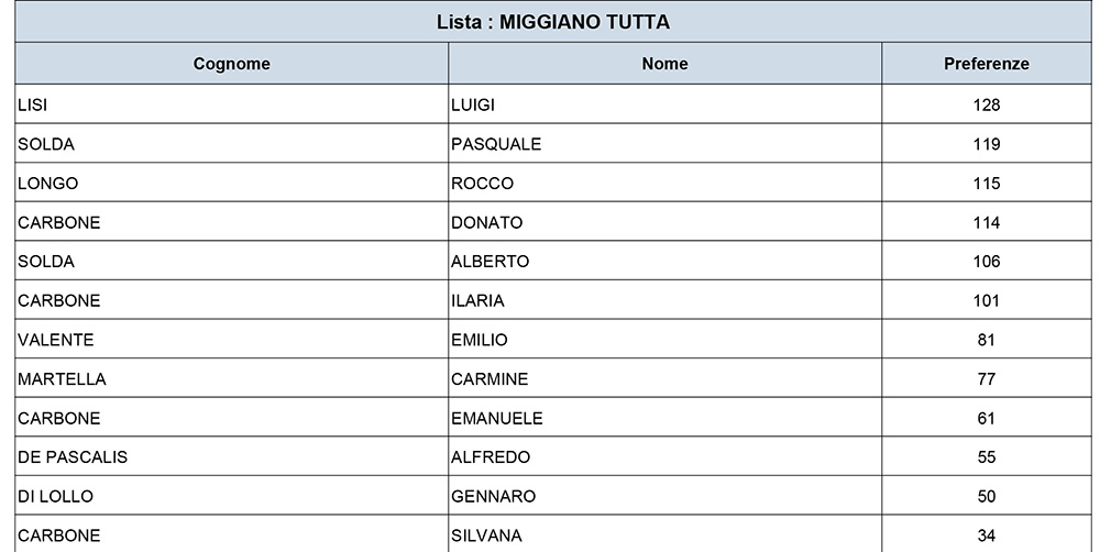 Il sindaco uscente a capo della lista, Uniti per Miggiano, si è visto riconfermare il mandato con 1.289 preferenze pari al 53,09%.