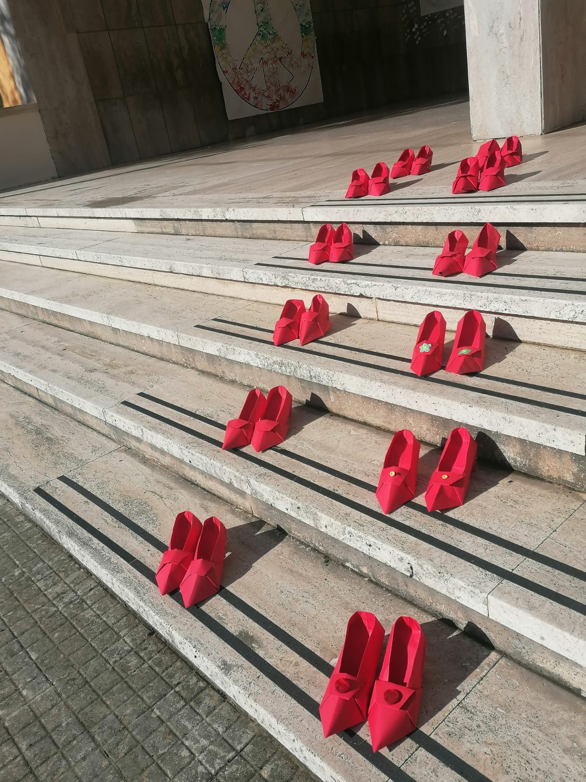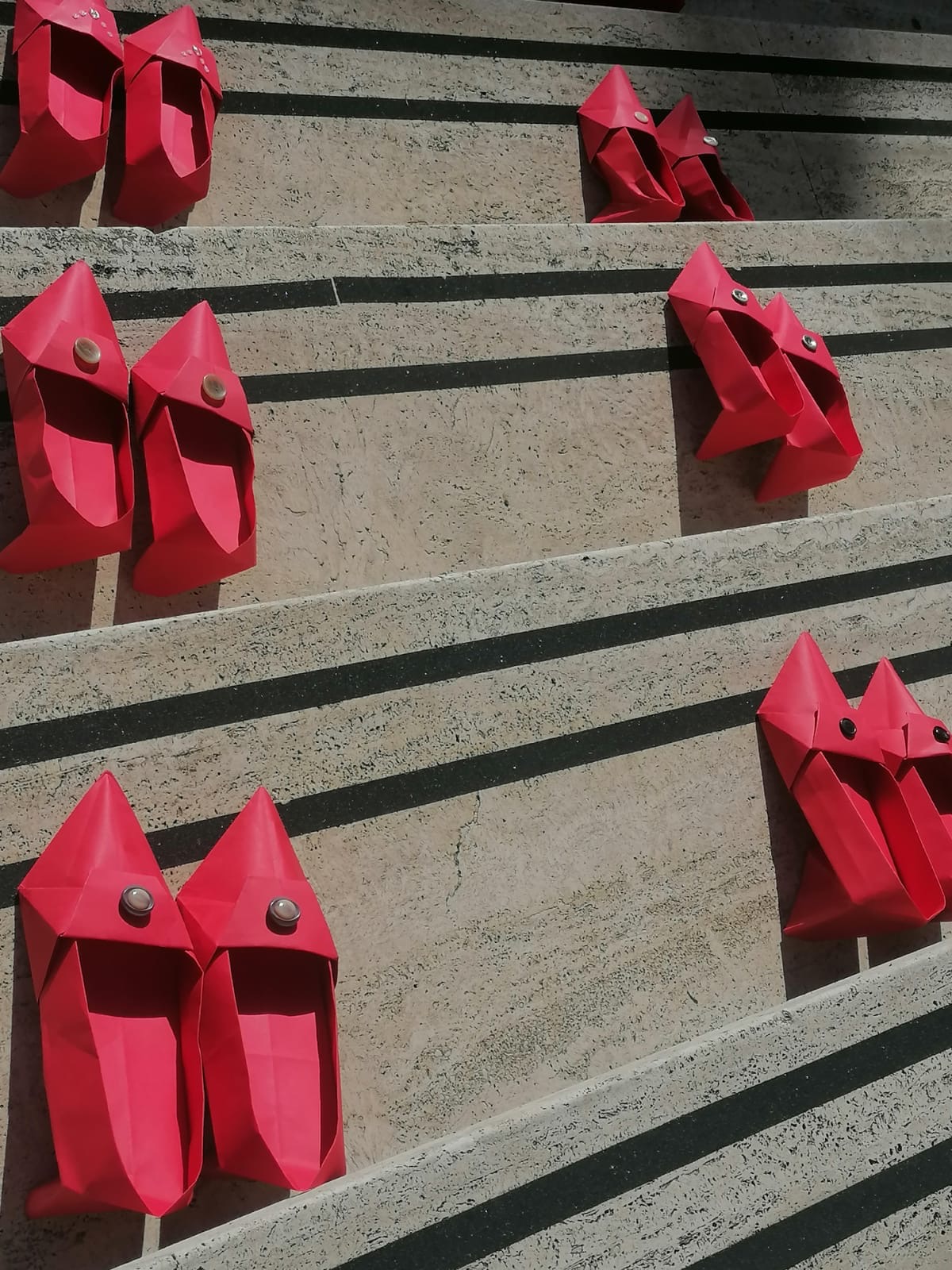 Scarpe rosse realizzate con gli origami dai bambini.