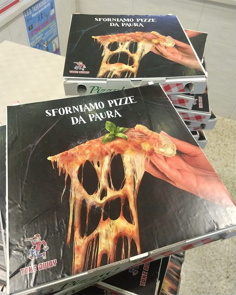 Allora sul cartone venne rappresentata una pizza con degli omini con la scritta “Sforniamo pizze come se fossero governi: velocità, quantità e varietà al vostro servizio”.