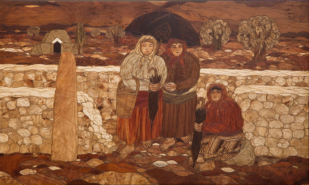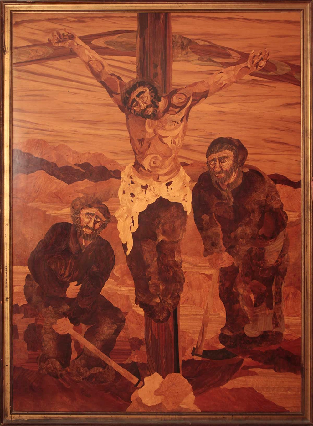 Nella tarsia, risalente al 1973, ai piedi di un Cristo-contadino dalle fattezze ruvide e spigolose, non compaiono le pie donne del dolore, bensì due contadini, entrambi col viso segnato dalla fatica e lievemente stralunato. Lo stesso Cristo sembra guardarli impietosito dall’alto.