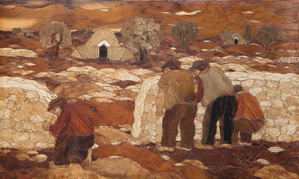 Prima fra tutte, la monumentale tarsia Salento nel tempo (300x600cm.), vero e proprio omaggio alla sua terra di cui racchiude un universo di simboli etnografici e culturali. L’opera, definita da Donato Valli «una sintesi organica dell’itinerario artistico di Fasano», presenta al centro un grande arco irregolare, quasi un alveo materno della civiltà salentina; ai lati, attraverso le figure dei contadini, sono oggettivate le stagioni della mietitura, della vendemmia e della raccolta delle olive. Realizzata nel 1992 e collocata nella Camera di Commercio di Lecce, è da considerare il più grande quadro intarsiato al mondo.