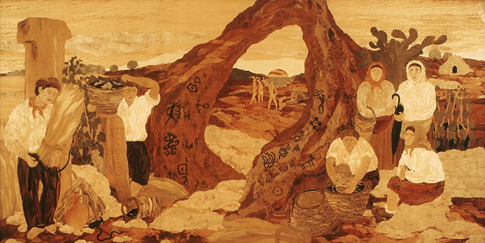 Mentre si moltiplicano le sue esposizioni in tutte le principali città europee e la sua presenza viene richiesta anche Oltreoceano (quella di non aver accettato di esporre a New York resta uno dei più grandi rimpianti dell’artista parabitano), il nostro intarsiatore si cimenta in una delle avventure più impervie e, insieme, fascinose, della sua vita. Verso la fine degli anni Settanta, approfondisce la ricerca sulle proprie radici storiche e culturali, lasciandosi affascinare dalle misteriose pitture preistoriche della Grotta dei Cervi (Porto Badisco, Otranto) scoperte nel 1970.