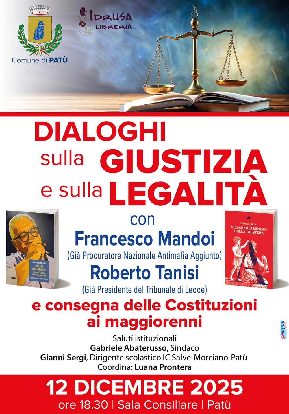 Gli ospiti saranno Francesco Mandoi, già Procuratore Nazionale Antimafia Aggiunto, con un’esperienza trentennale nel contrasto alla criminalità organizzata, e Roberto Tanisi, già Presidente del Tribunale di Lecce e autore di numerose pubblicazioni sui temi del diritto e della giustizia.
