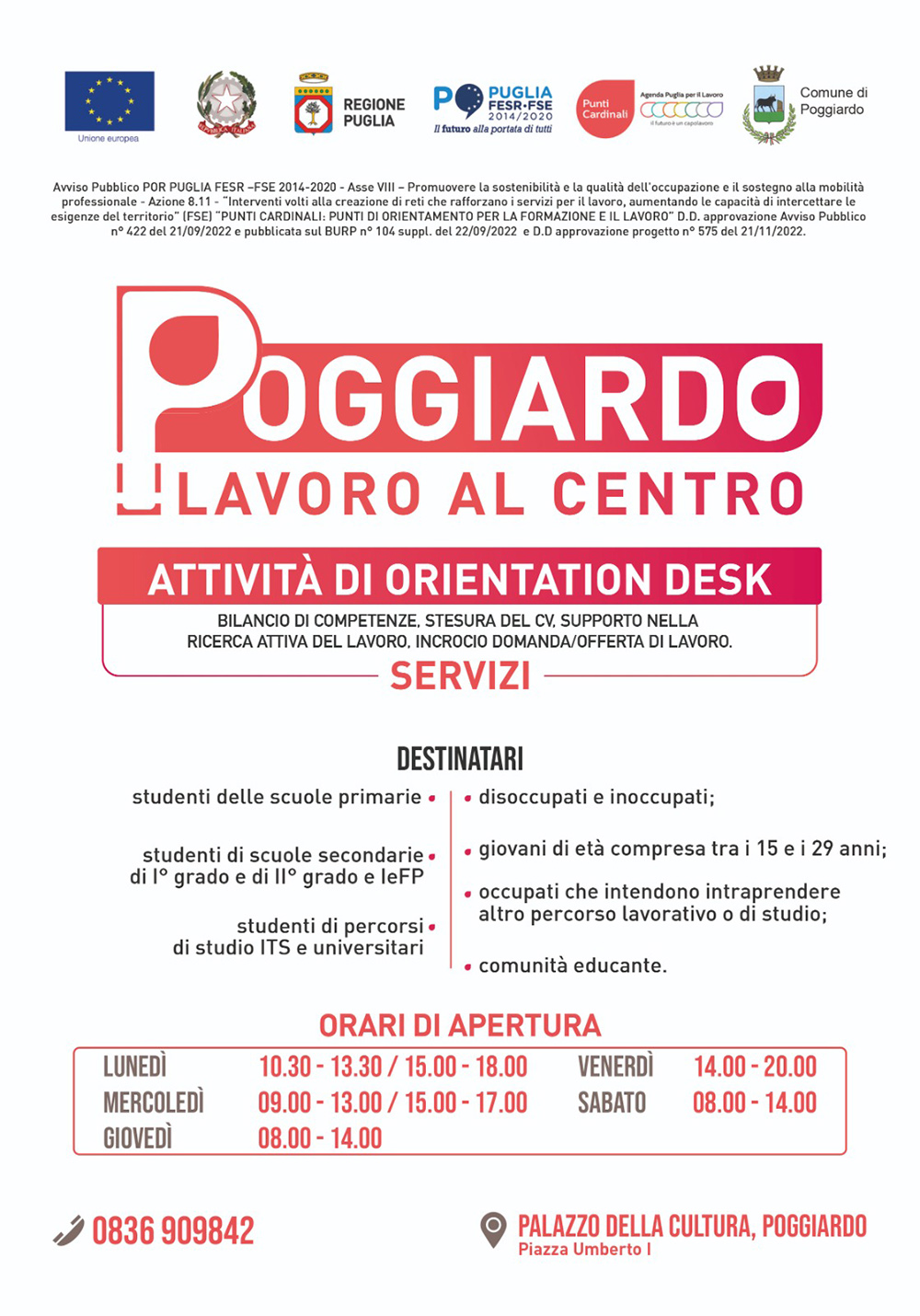 Il Comune di Poggiardo mira a costruire un patto territoriale volto alla realizzazione di azioni di politica attiva, raccolta dei fabbisogni occupazionali e formativi del territorio, informazione, orientamento e matching domanda-offerta di lavoro, coinvolgendo sistemi produttivi locali, aziende e imprese. Lo sportello d’orientamento nel palazzo delle Cultura
