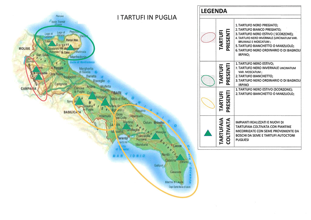 In Puglia, le 7 aree tartufigene, da nord a sud, sono state individuate in: Monti della Daunia, Gargano, Murge Nord-Ovest, Murge Sud-Est, Valle d’Itria, Arco Jonico, Salento.