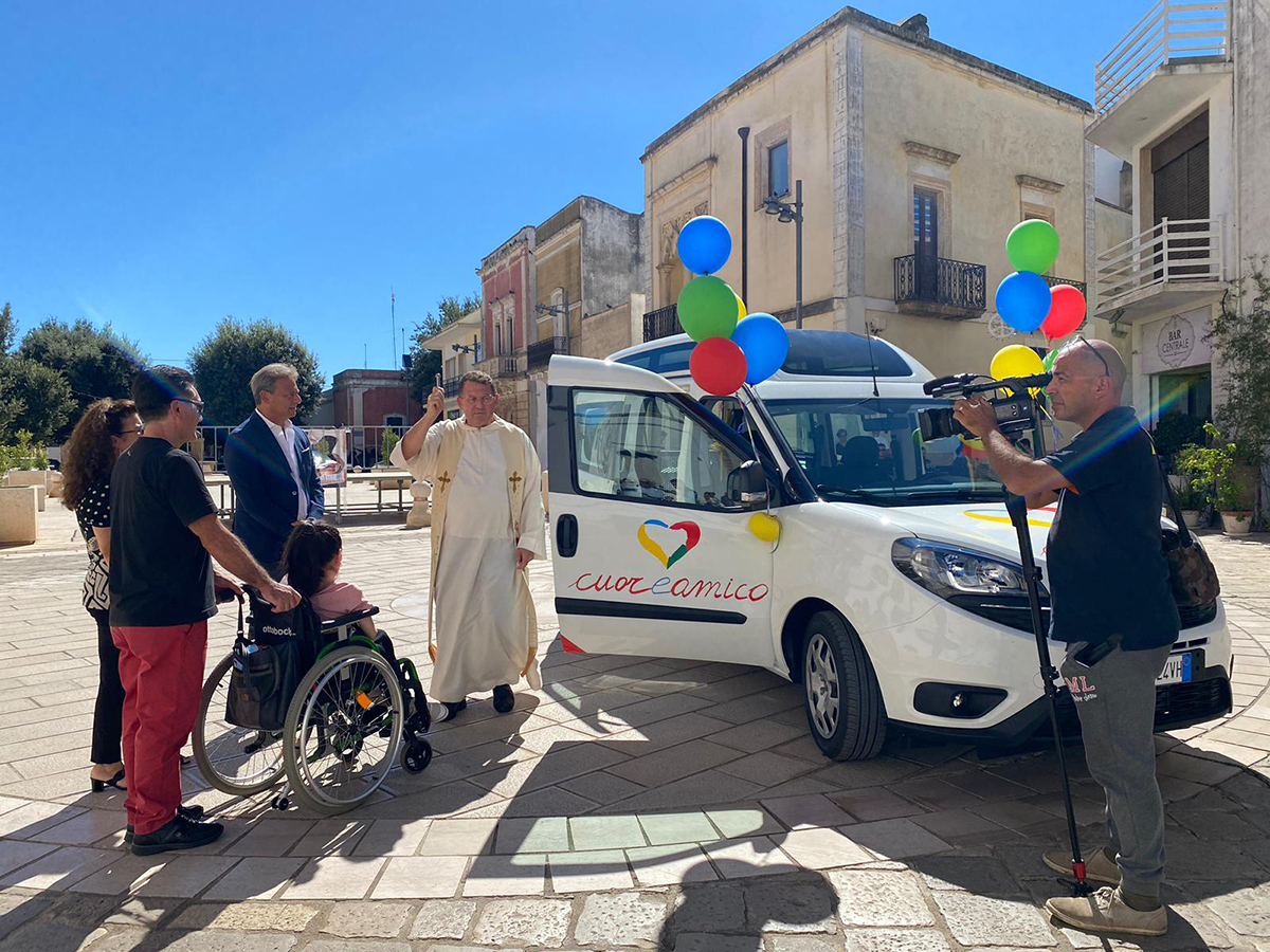 In Piazza San Sebastiano a Racale il parroco della Chiesa di San Giorgio ha benedetto l’auto attrezzata che Cuore Amico ha donato a Marika.