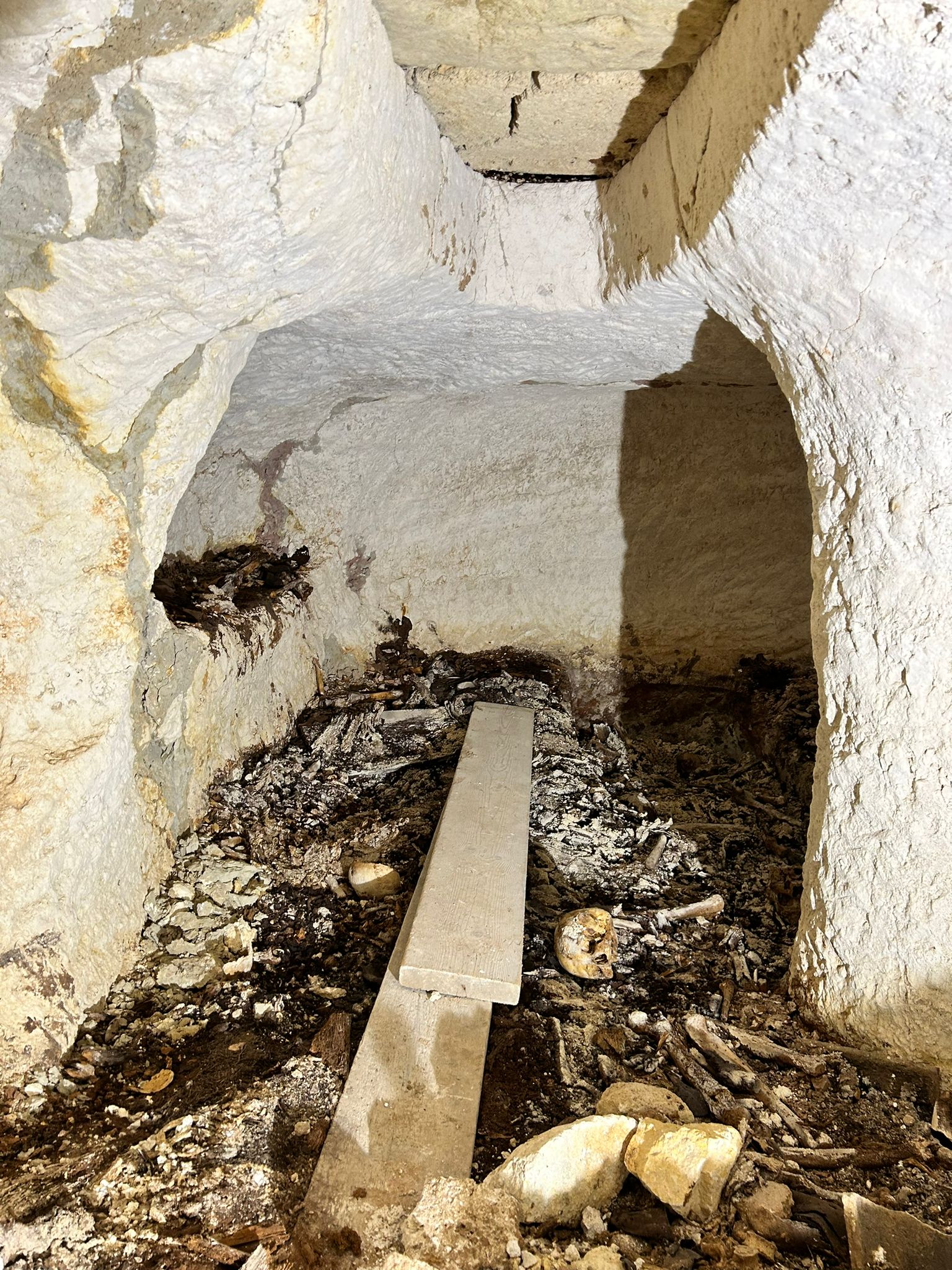 E poi ancora un’altra scoperta. Il nuovo volto, emerso di metro in metro, ha fatto maturare negli addetti ai lavori la convinzione che la chiesa potesse celare altro. Il georadar ha fatto il resto, segnalando un vuoto accanto alla cripta, sotto al pavimento della chiesa, proprio nel suo punto centrale. Gli scavi hanno fatto luce su un’altra cavità, non comunicante con la precedente, e dalle evidenti finalità funebri. Si tratta di una seconda cripta, un ambiente cui si accedeva da una botola, senza una scala. Evidenti le sue finalità, di natura funebre: al suo interno ossa, del legno (presumibilmente resto di antiche bare), degli abiti (con cui chi riposa qui era stato sepolto). Il soffitto di questa cavità, poi, corrispondente con la base su cui poggia l’attuale pavimento (realizzato a metà del secolo scorso sopra al precedente) porta traccia di altre sepolture, tombe scavate nella roccia.