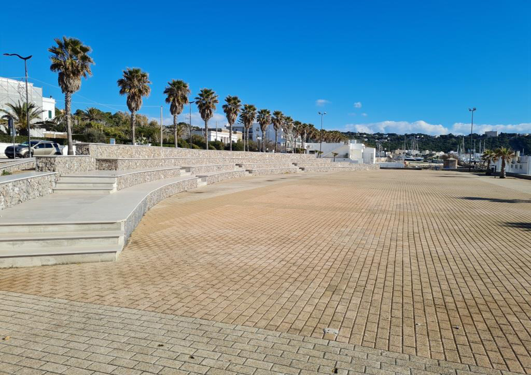 Un luogo che sarà arricchito con l’utilizzo di tecnologie innovative, dove sarà possibile godere delle suggestive immagini mutanti proiettate dall’affaccio, all’interno dell’insenatura tra Punta Ristola e Punta Meliso, del mare e del cielo, con il panorama del Faro e delle sue luci notturne. Il progetto andrà ad ampliare il marciapiede che costeggia il Lungomare C. Colombo; inoltre, il muretto della Piazza, realizzato mediante gabbioni metallici, permetterà di avere un affaccio protetto ai fruitori dell’area che vorranno godere delle viste sulla Piazza o sugli eventi che si svolgeranno, accomodati sulla gradinata semicurva, raggiungibile attraverso scalette e il muro di delimitazione delle rampe pedonali. Il tutto sarà realizzato mediante la posa di gabbionati metallici riempiti di pietra calcarea, semplicemente adagiati sullo strato di riempimento, previa demolizione della pavimentazione esistente.