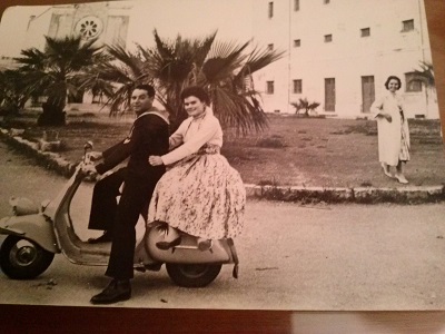 Emilio, poco tempo dopo l’emigrazione da Marittima a Monteruga, si era arruolato in Marina, spesso si trovava di stanza a Taranto e faceva su e giù, per vedersi con la fidanzata, a cavallo di una Vespa (esiste un’altra istantanea, invero non comune in quell’epoca, con i due innamorati in sella allo scooter, a Monteruga, e, sullo sfondo, sorridente, Maria, la sorella di Emilio).