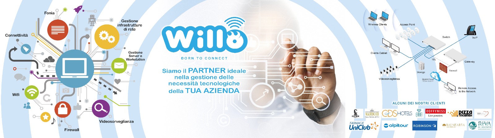 «Abbiamo sviluppato e continuiamo ad approfondire sistemi molto complessi pensati per far fronte alle esigenze di aziende private o uffici molto strutturati, senza trascurare l’importanza della connettività per luoghi pubblici e di svago quali ristoranti, centri commerciali. Willo è un Internet Service Provider che eroga servizi di connettività wireless, xdsl e Ftth; nei casi in cui si rende necessario un elevato livello di affidabilità, proponiamo e gestiamo soluzioni di backup a caldo della connettività.