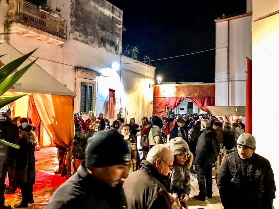 I circa 230 figuranti danno vita alle scene bibliche, animando 40 scene di vita quotidiana, appartenenti a un passato ormai lontano: dall’Annunciazione alla visita di Maria a Sant’Elisabetta, al Matrimonio, alla Sinagoga e gli Scriba, ma anche le varie botteghe, per un evento che valorizza varie figure dell’artigianato di una volta, come i “cannizzi e panari”, la cardatura e filatura, le ricamatrici, il bottaio e il mosaicista. Un viaggio tra i sapori tipici, con il forno con le calde puccette con le olive e l’oste che offre vino agli avventori, insieme a calde pittule e al “pane rustutu” condito con olio. Le massaie preparano la pasta della tradizione salentina, ai mastri casari che producono il formaggio in tempo reale, con i metodi e gli strumenti di una volta; e poi ancora soldati, pastori, colorate bancarelle di frutta e ortaggi.